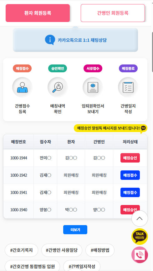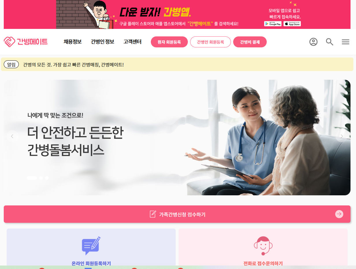 이제 간병메이트에서 환자와 간병인의 만남이 보다 쉽고 편리하게 이루어집니다.